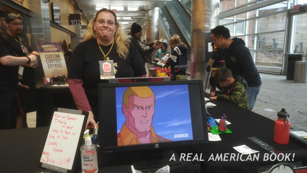This was funny. Podcast Mark and I interviewed him in March and I’m always surprised when people know what I look like even though I plaster myself onto the internet. And it was an unusual episode in that we talked for at least 45 minutes without covering G.I. Joe. Kickily had driven the three(?) hours from Minnesota to attend the con, and to informally be a vendor. He was camping out at someone’s table, had brought paint, and had a stack of small paintings (what he considers sketches, not full paintings) for sale. Many were G.I. Joe, a few were M.A.S.K., and some were of Minnesota Vikings! I gawked at all of them, one by one. The color! Sorry, I didn’t get a photo. I wanted to show Kickily a chapter of my book, but I was also enjoying not lugging around my laptop, perhaps later at the hotel bar?