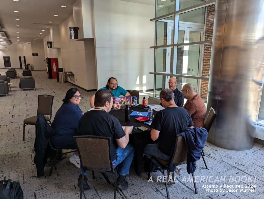 I was hungry, and lucky that my section headed to the buffet line first. The catfish was excellent. I sat with David T. Allen (who hosts the G.I. Joe New News Review podcast) and toy collector Jason Packard, both of Florida. We talked about conventions, and I said that as small as AR was, it didn’t feel small, I didn’t run out of things to do or people to talk to. Allen observed that Assembly Required isn’t a convention, it’s a community event with a convention in the middle, which I thought was apt. Allen is a fixture at AR, and helps run JoeFest (a much bigger show), so I am intrigued by his take on these events. I went to order a black bean burger at the bar, and wound up at a different table with Dak Knomadd (pictured above right, with sunglasses), Rachel Mendoza, and Michael Charles Hill. We talked about comic book retail, convention travel, and Hill explained how his original story for the con came to be — plans for a shared con-exclusive comic book with another con didn’t work out, and having an illustrator draw this story as a comic also didn’t materialize, so Hill wrote it in G.I. Joe teleplay format just for AR, which was his preference in the first place. (More on this in Part 3/Saturday.) Here’s Hill, who I met a year earlier at AR ’23, and interviewed by phone and saw in August in the interim: