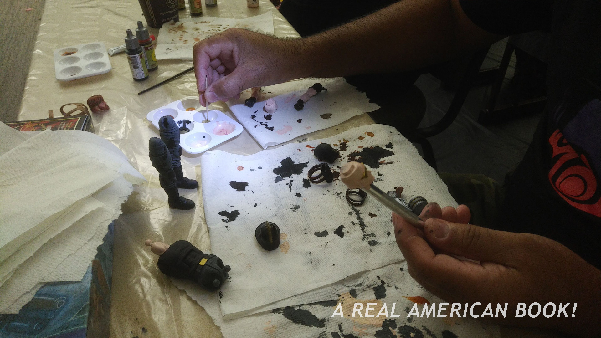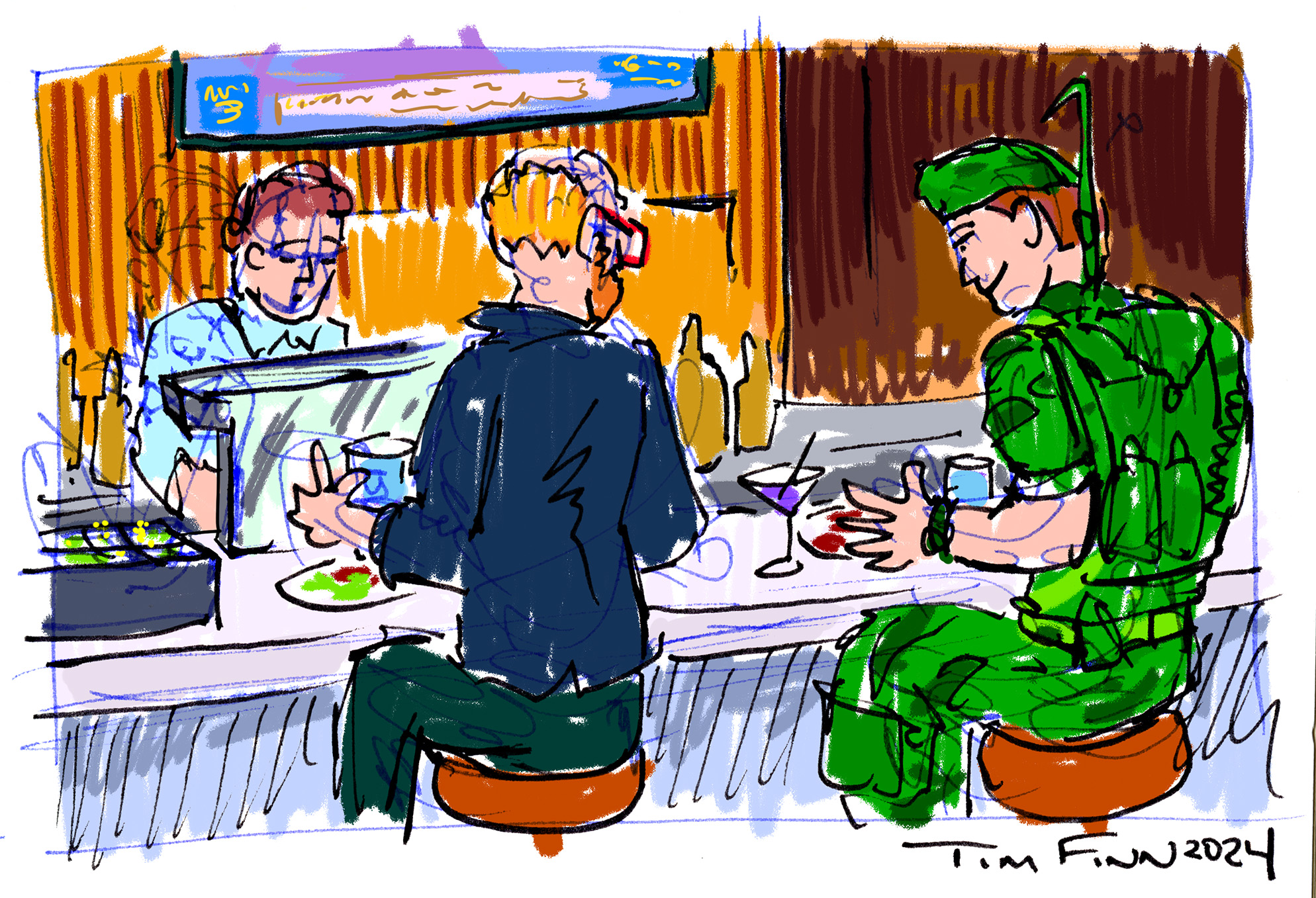 But who should happened to have ambled up next to me at the bar? It was toymaker, G.I. Joe art historian, book publisher, web maestro, and all-around nice guy Carson Mataxis. He was not selling his art book at AR, a break from his last few conventions this summer and fall, so he could relax and actually take in the con as an attendee. Mataxis was in fact in the Customs Class that morning, and one of the photos I had taken was over his shoulder — certainly he would not have been painting a plastic head at 11am if he’d been “on duty,” lugging mics and speakers and boxes of heavy books! There’s no photo of our lunch, but here’s an artist’s rendering: