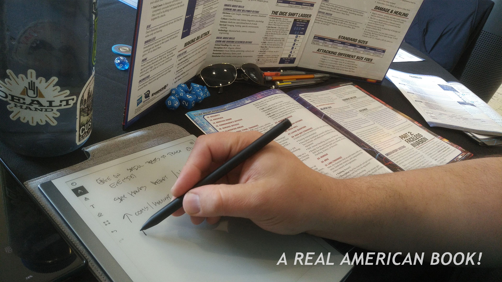 While some players want to perform in character, and others wish to problem-solve, I want the story to keep progressing. And while I like imagining the game like a movie in my head, I’m out of practice when it comes to all this waiting for the other players to take their turns. And I wanted to fight Destro and Cobra Commander at Cobra HQ, but of course that’s not reasonable for a Level 1 new recruit. It was fun to see Wolfe play in character, and by that I mean perform — he did Mutt’s voice and delivery from the Sunbow cartoon, whereas the rest of us spoke indirectly, my character goes over there, I think we should attack, Hey I have a tech specialty so I can fix that junction box. Thanks again to con chief Brian Sauer for inviting The Dealt Hand to explain and officiate all four Renegade G.I. Joe games, and to Joe Roth for GMing this specific adventure. We did finish ours, and Hawk congratulated us at the end (Roth half reading/half performing), and it only took four hours! Fun fact: Everyone had a water bottle with them, distinct from the gamer stereotype of energy drinks.