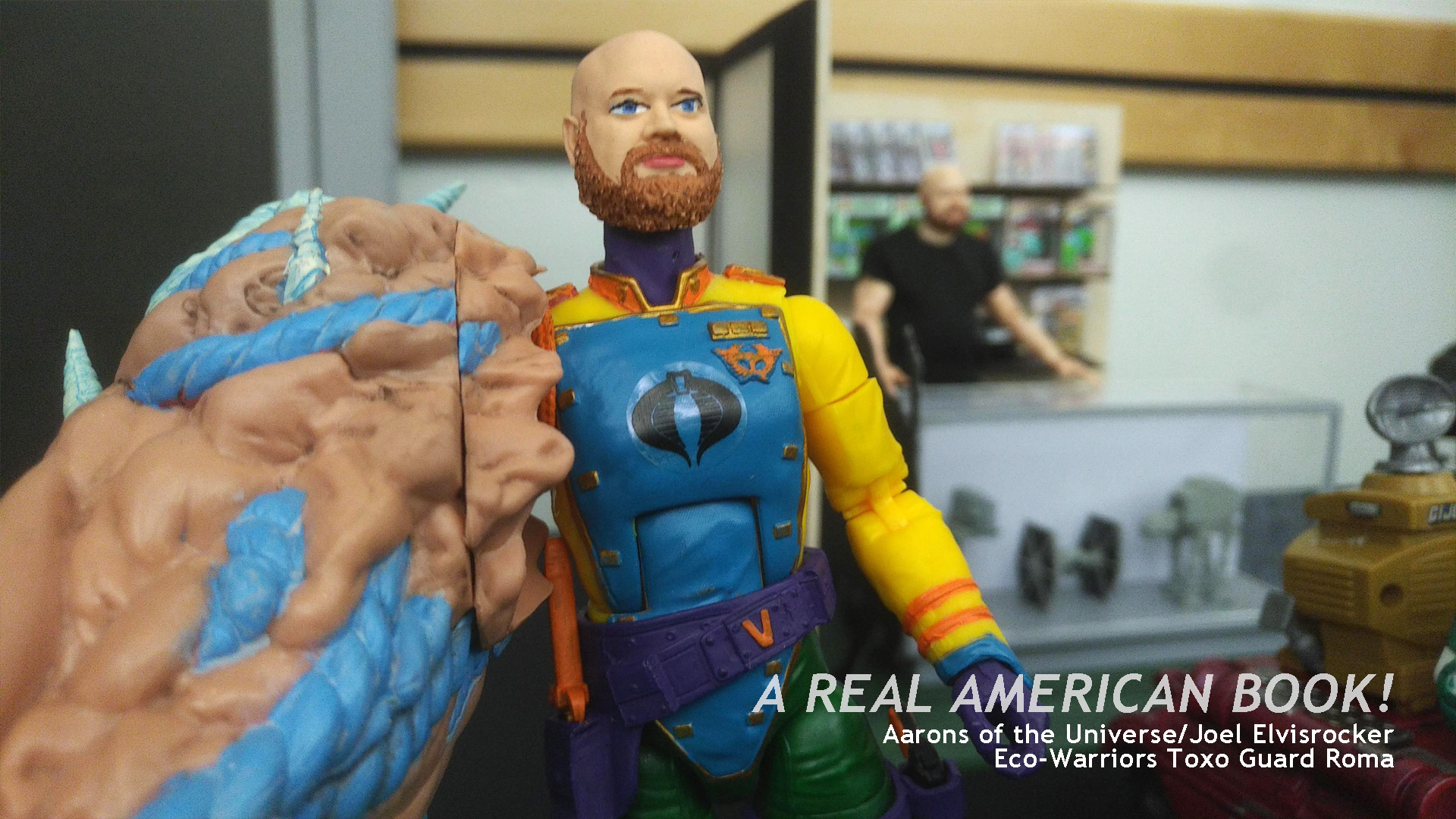 For this one, Joel Elvisrocker has turned a Crimson Guardsman into an Eco-Warrior and I find the end result fun and disturbing. Out of focus in the background is normal, regular Detrick at his store.