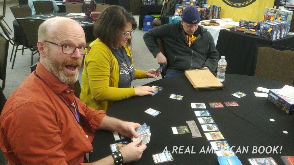 Mary Roth of The Dealt Hand remembered me from the past two years. I seem to be only playing Renegade’s G.I. Joe DBG once a year, and I seem to only be able to pull that off when I fly to Iowa, even though I own it (and several expansion sets) back home. I’m still not fully concrete on the rules, so Roth was both teammate and coach. Here we are: