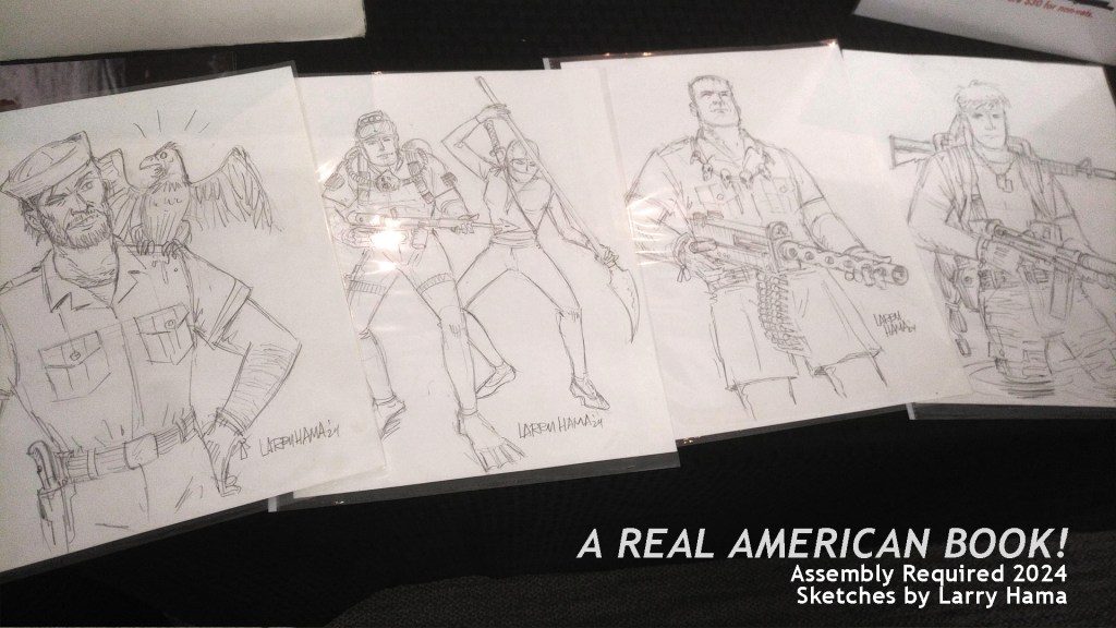 Dealers started to dismantle their shelving and pack up their toys, but I wanted to continue playing. We probably would’ve been left alone for another 20 minutes, but I figured Larry Hama and Ron Wagner would be packing up and leaving, and wanted to say goodbye. Hama had put out some artwork for people to pick up. I love seeing his sketches. He also had something funny to say about Shipwreck’s parrot, Polly, and noted that this (below, right) was the first time he’d ever been asked to draw Wade Collins on patrol in Vietnam: