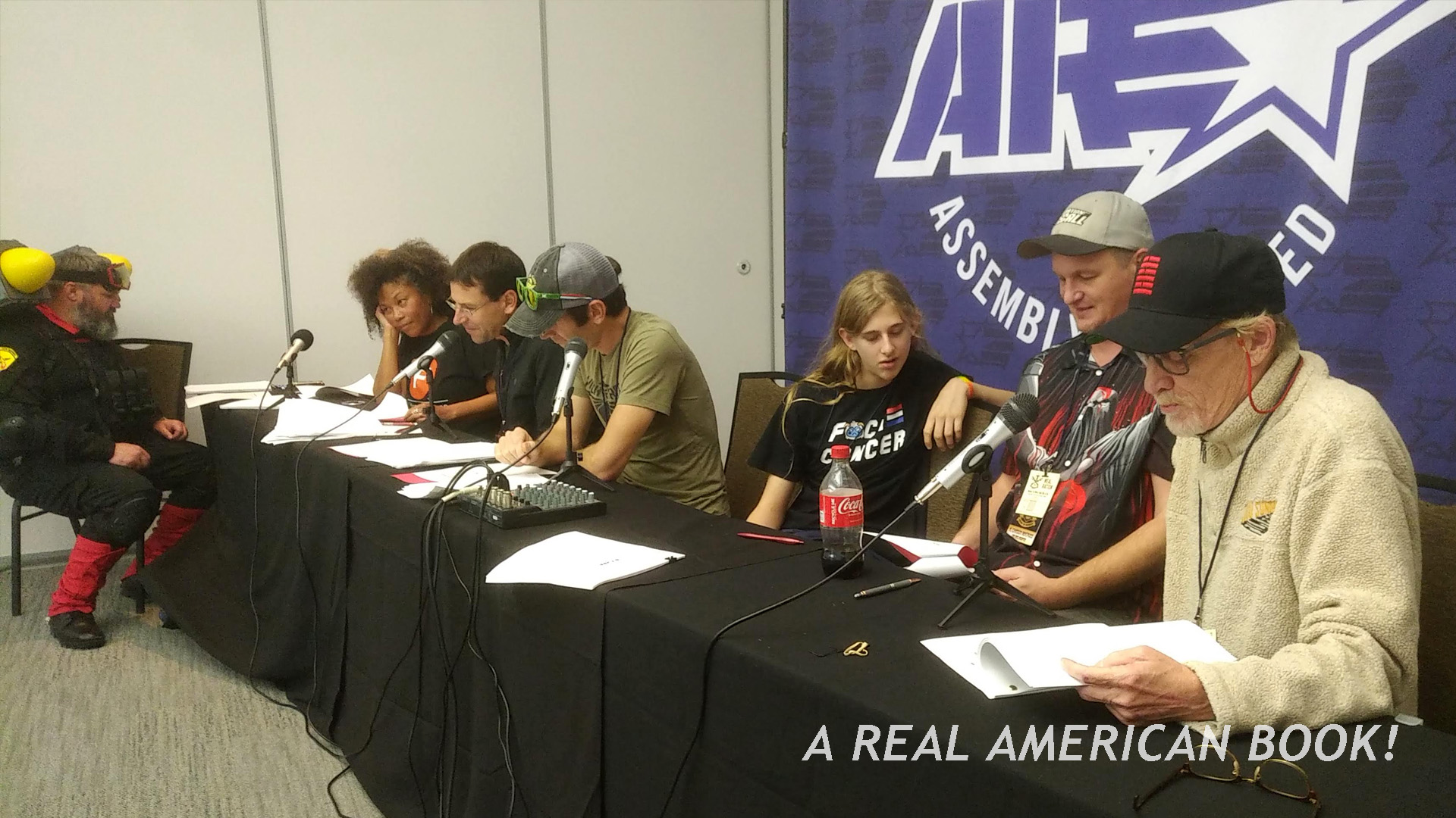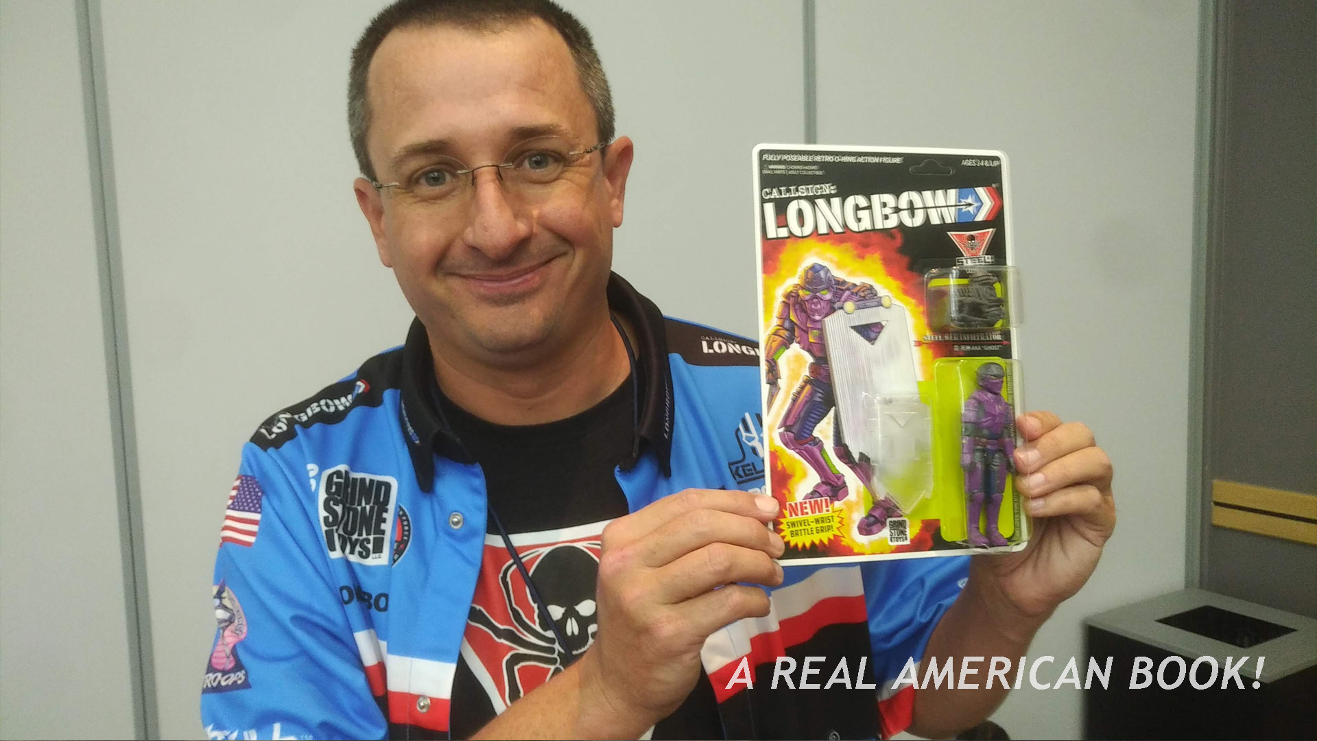 Sitting to my right were Troy McKie, John Kukovich, and Mikey Kukovich of Grindstone Toys. I’d barely said hello, so now felt like a good time to catch up. I asked what it was like splitting the team between two conventions held at the same time back in August. Also, I had received the Kickstarter edition of their Callsign: Longbow comic in the mail just before my trip out to AR, and brought it with me to read on the plane. It was good, and I wanted to tell them in person, and ask about issue #2. (McKie had previously told me that as much as the team wanted to push ahead with storytelling in comic books, if the comics got too far ahead and toys still hadn’t shipped from China, backers would feel like the company wasn’t prioritizing properly.) I also asked them about current challenges for their toy line, but without hitting the “Where are my Kickstarter rewards???? It’s taking too long!!!!” note that they (and other small toy companies who crowdfund) likely get all the time. Here’s McKie, from inside the con at the Grindstone table from earlier that day, holding one of their first figures, the 1980s-G.I. Joe-ish Steel Web Shock Trooper action figure:
