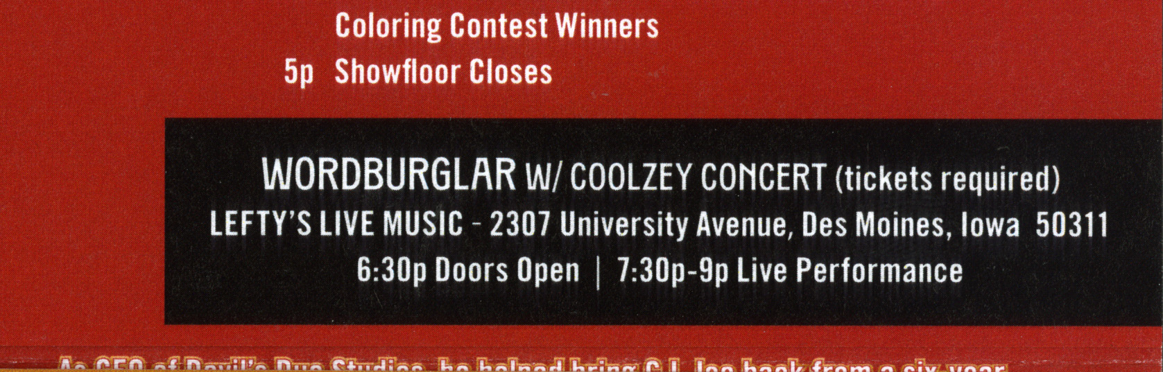 Burg has also appeared on Talking Joe, and earlier that day had stopped me in the hallway between the exhibit hall and the panel room to show me some non-G.I. Joe comics written by Larry Hama that Hama had just signed for him. Wordburglar is Canadian, so it’s probably more work to plan a tour or even a single show in the States. But someone smart, either Wordburglar himself or the AR organizers, or both/all, figured on having him appear at the convention and then booked a live performance nearby an hour and a half after the convention ended. Brilliant!