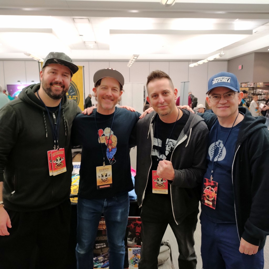 Hama said invited me along for dinner, so a) I’d be stepping away from the Deck-Building Game in progress and b) not attending the Wordburglar show. This was a small disappointment, and requires some explanation. Wordburglar is the performing name for Sean J. Burg, a hip hop recording artist known for his pop culture songs and lyrics, and the cool visuals of his music releases. G.I. Joe fans may best know him for his album Welcome to Cobra Island. He was an official guest at AR, and was selling merch at his table. I neglected to get a shot of him there, but here are Chris McLeod, Wordburglar himself, toy photographer Paul “Plastic Battles” Pants, and Operation: Recall contributor Joe Goldston in front of Wordburglar’s table: