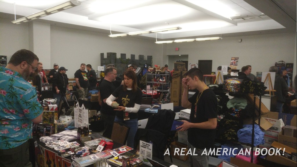 I could hear from the other room that con chief Travis Webber was starting to call out raffle winners over a microphone, and part of me wanted to walk away from the Deck-Building Game to see what the large crowd was seeing. This was now the center of the convention (I left our game for a moment to get a not-great photo), and even though there was another 30 minutes of shopping, no one was walking around with money in hand, as the con had paused. I played the card game right up until 5pm, and it turns out, I missed the auction for the one-of-a-kind Josh Blaylock art and paperwork!