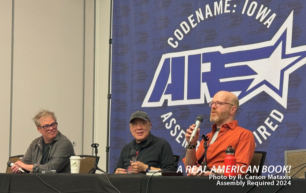 Hill was a producer for the ’80s G.I. Joe cartoon, and wrote a few episodes. He’s been enjoying some appearances at G.I. Joe and Transformers conventions (he also wrote for that series) these past two years. And for Assembly Required 2024, Hill expanded a short story he’d originated in 1986, turning it into a full teleplay script. The fun wrinkle was that it was now more Destro and Iron Grendiers-themed. I got to take part in a live script reading at a Transformers convention in 2004 with some big deal voice actors, so I was happy that A) the nice folks pictured below got to do something similar, and B) with the “casting” process more in line with the relaxed atmosphere at Assembly Required, this would be less stressful. While I missed the panel, I did come back from lunch in time to take this photo just as Hill, reading all stage direction, concluded the final page.