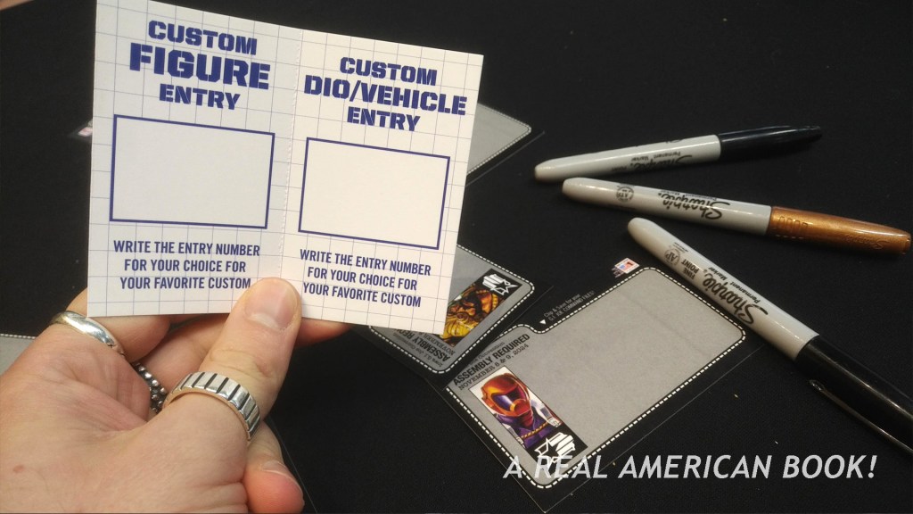 While I was spending time around the registration desk, I noted that the art contest entries were all in front of me. Here are some highlights. Continuing a thought from Part One/Friday where I pointed out con organizer Brian Sauer’s design skills and attention to detail, here’s the lovely folded card attendees get to vote on the custom contest. With the blue text and light background grid, Sauer refers back to the 1980s A Real American Hero vehicle blueprints, and makes something that could be a blank scrap of paper into another thoughtful part of the convention.