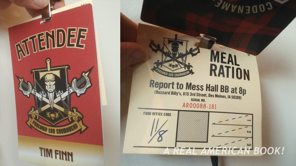 Adding to earlier paragraphs about how nice all the website, signage, and badging at Assembly Required is because con chief Brian Sauer is a great graphic designer, here’s one more. The attendee badge is printed on a thick plastic, and the limited-to-100-seats Friday dinner pass was this nice additional piece. I’m just repeating myself now, that this military-looking fake piece of printed bureaucracy was funny, nicely tied into the convention theme, and was on a substantial and satisfyingly thick card stock. When the con organizer cares this much, that feeling spreads through the rest of the event in subtle ways and I have a better time, even if I can’t quite explain why.