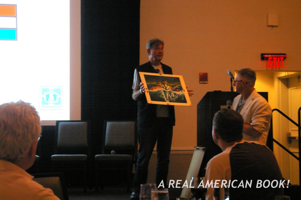 [In a surprise move, Alan Hassenfeld then pulls from a large envelope an original Don Stivers Adventure Team painting that makes Derryl DePreist gush. Hassenfeld refers to having the carry such art by hand to Hong Kong.]