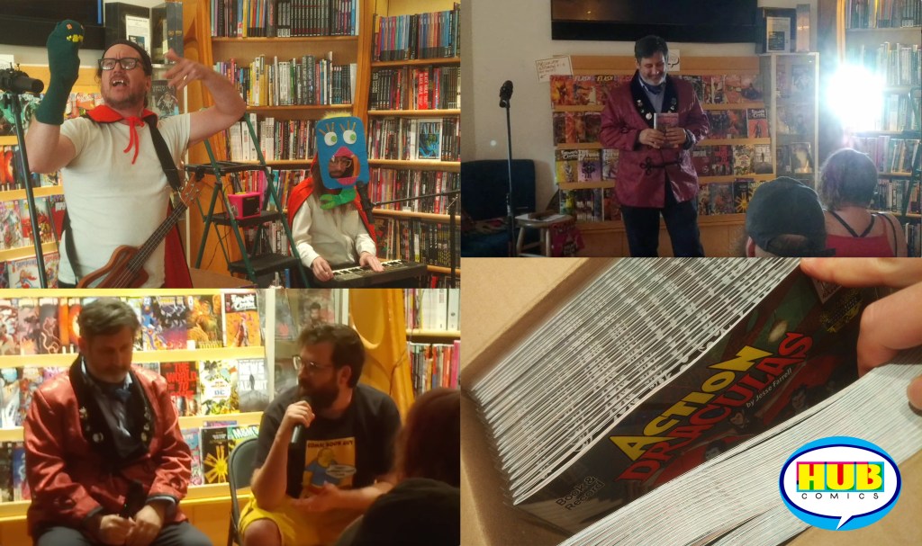 Back in Part One, I explained that I needed to depart from the con early to attend an event at my store, Hub Comics. Quick recap: Hub Comics (that’s my store!) manager Jesse Farrell self-published the third issue of his comic book, Action Draculas, this one with a vinyl record of his own design! And in my 13 years at the shop, he’d not yet planned an event for his own work, like a book signing or artist talk. Until now.