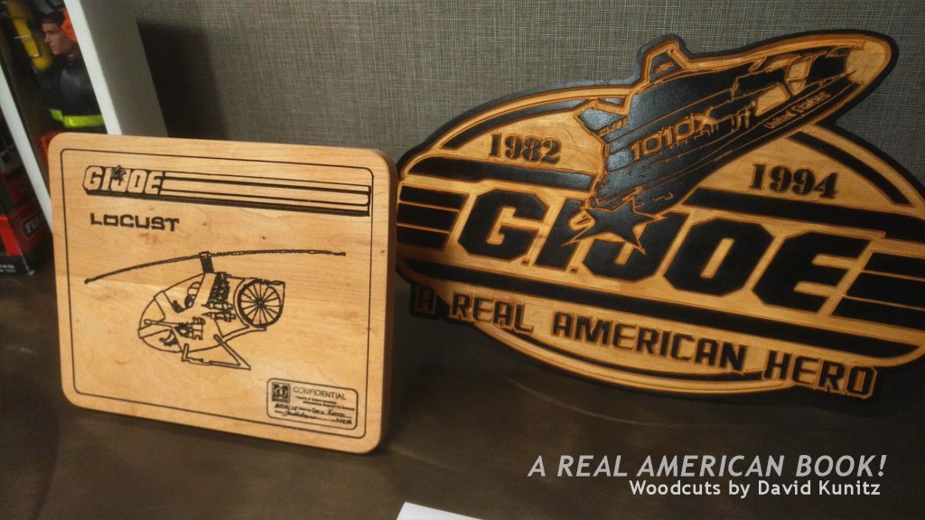 Two pieces of wood cut art by former Hasbro designer David Kunitz: