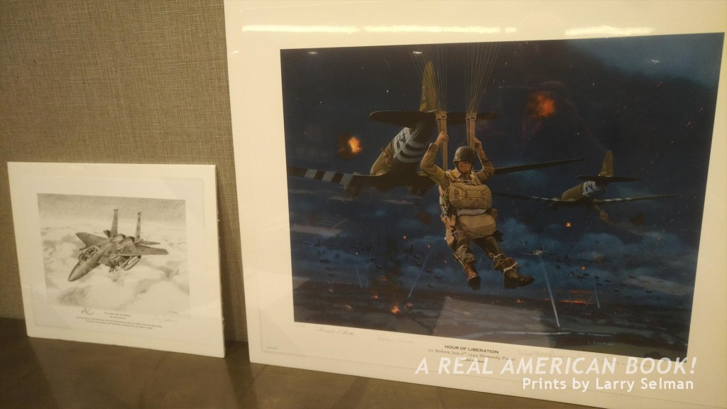 On left, in black and white, “The Lone and the Brave,” a print by Larry Selman. This was signed by Selman and a jet pilot. Knowing what little I do from talking with Selman at breakfast that morning, I get the sense that this pilot flew this jet. I wondered who had commissioned the piece, and if Selman took it further and painted it. As lovely as his color work is, I was particularly struck by this pen and ink piece. On right, in color, a print of Larry Selman’s “Hour of Liberation,” signed by the artist and three D-Day veterans.