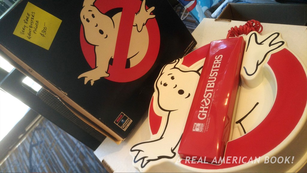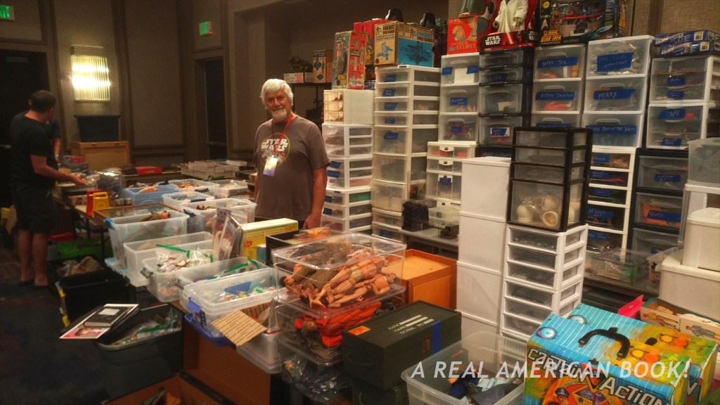 (I’ll flashback here for this paragraph to something I forgot to post in Saturday/Part 2: I bought a toy! An expensive one. A dealer had a mint unopened 1991 Snake Eyes figure. I kinda need one that I can photograph for my book. Funny thing is that I already own a mint unopened 1991 Snake Eyes figure, but it’s sealed in a time capsule that I can’t open. Therefore I’ve been vaguely aware, these last two years of conventions, figuring out what I need to scan or photograph for my G.I. Joe history book, that I needed to source a Snake Eyes. Here was one for a good price. Then the dealer said “which one do you want?” and pulled out two more, each a little different — one with a name toy store price tag, with with a generic price tag, one with a contest sticker on the front. Good news, I talked him down 25 bucks because I paid in cash. End flashback.)