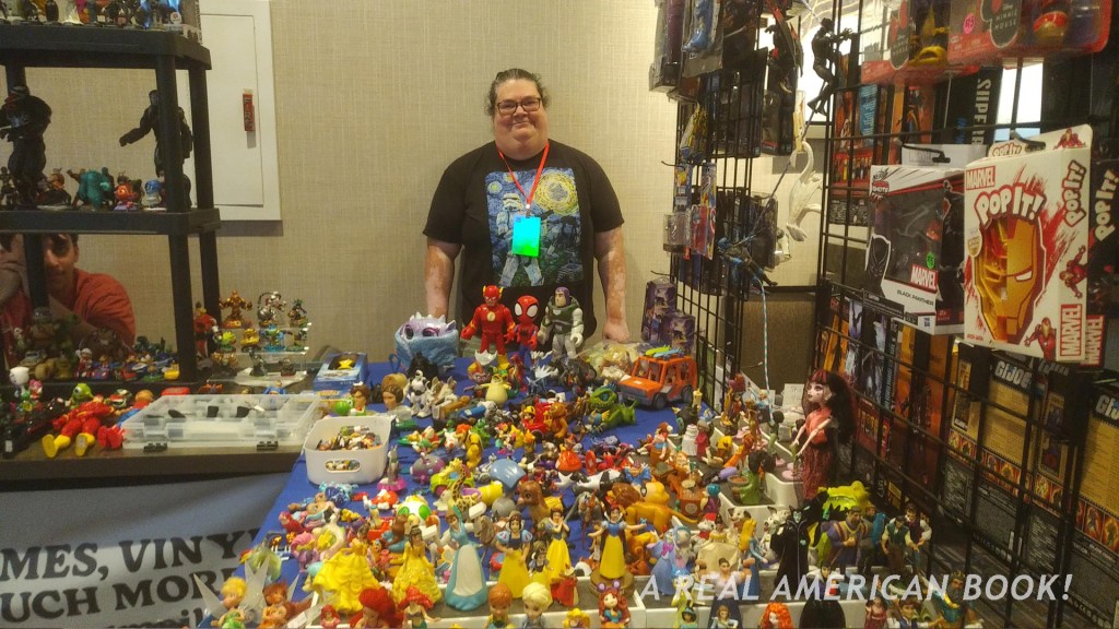 It was now 9:15am. The con’s “preview” hour was underway, the first panel was at 10, and I was running out of time. I crossed the lobby and saw Vinnie D’Alleva with a roller bag. Surely he wasn’t leaving this early? The image made me a little sad — someone departing a con, especially a guest. But no, D’Alleva still had “signing hours” at his table in the showroom, and was maybe part of a panel later on. He was probably bringing his luggage to the front desk in advance of checkout, and would probably head out in the afternoon or early evening. But the last day of a con is always a bit melancholy.
