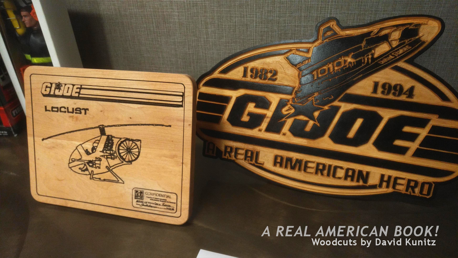 Two pieces of wood cut art by former Hasbro designer David Kunitz: