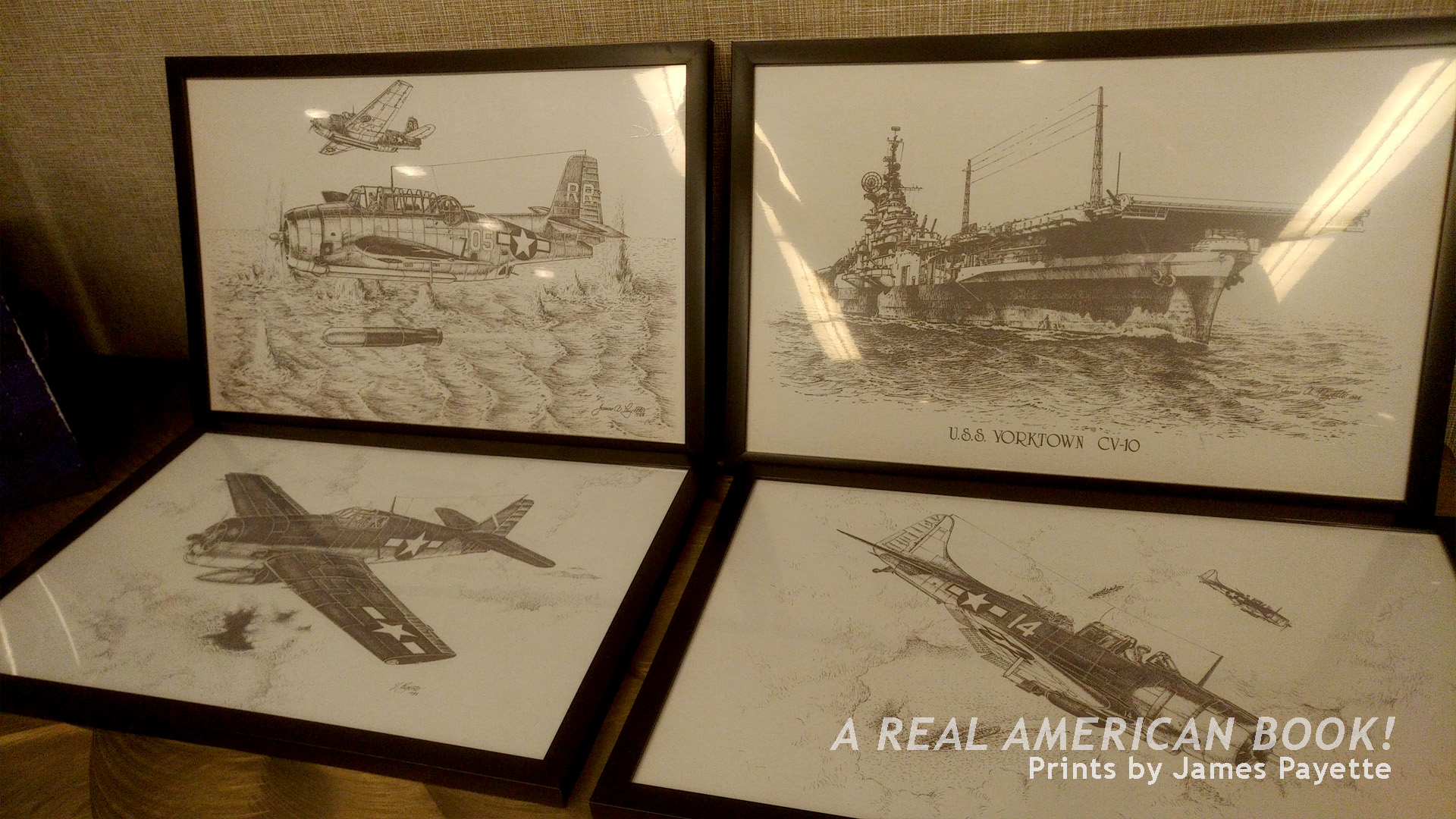 On left, in black and white, “The Lone and the Brave,” a print by Larry Selman. This was signed by Selman and a jet pilot. Knowing what little I do from talking with Selman at breakfast that morning, I get the sense that this pilot flew this jet. I wondered who had commissioned the piece, and if Selman took it further and painted it. As lovely as his color work is, I was particularly struck by this pen and ink piece. On right, in color, a print of Larry Selman’s “Hour of Liberation,” signed by the artist and three D-Day veterans.
