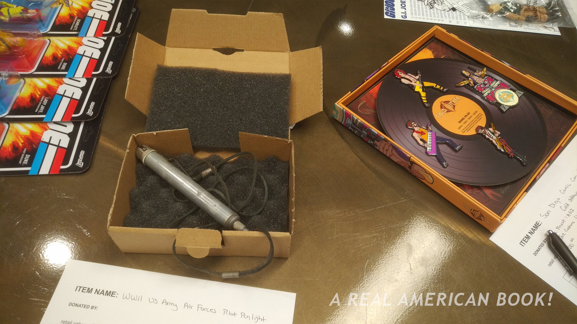 This one was the most unusual item in the auction, a World War II US Army Air Forces pilot pen light. The “donated by” line was left blank, and when I checked there were no bids, adding to the mystery. Everything in the auction was two or 20 years old — merch, prints, toys. Here was an actual historical object. I wondered if I should bid and give it to my older friend, a writer who likes sitting in a cockpit at that aviation museum in NYC.