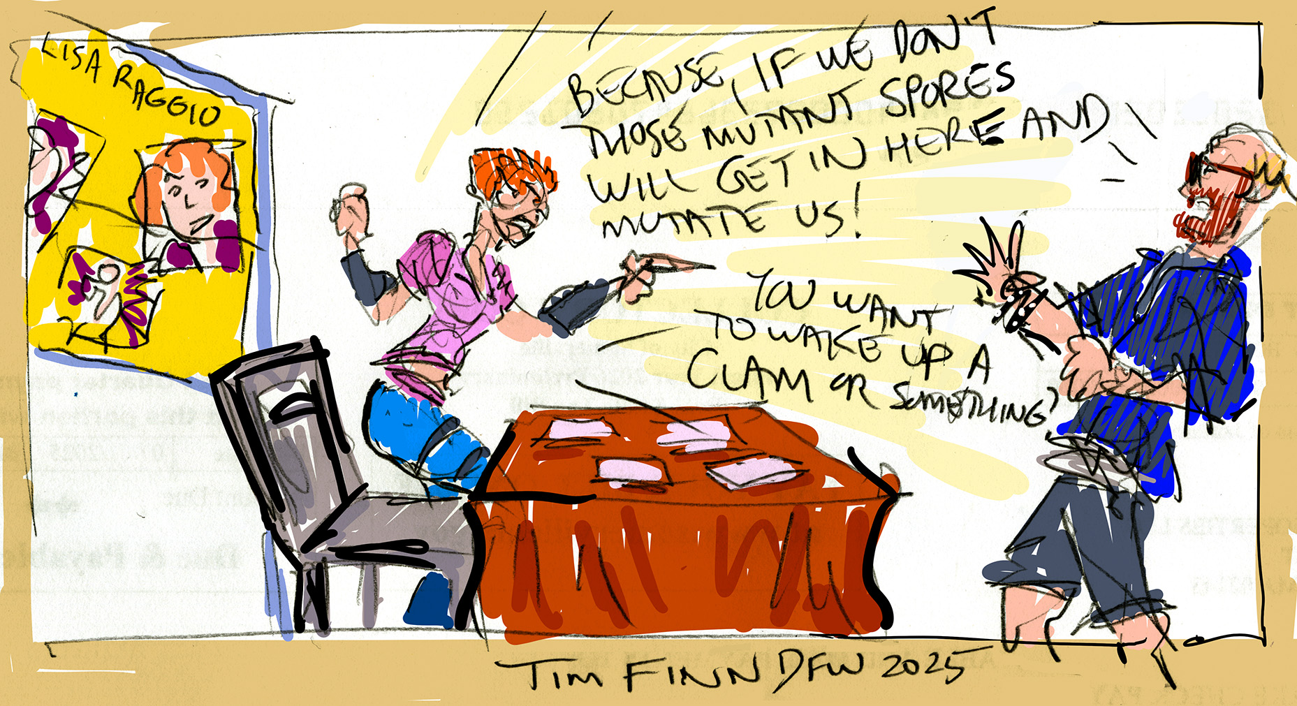 Brian Savage rolled up with his breakfast, and we three talked. I asked Selman about his studio. He mentioned an uncluttered room in his home dedicated to painting, with rotating art on his walls, plus props and costumes in his basement. Savage talked about flying a plane, and I asked about Selman’s drive home and the Aviation Artist Society of America. He had thoughts about organizations like that, and I mentioned there’d been attempts in the ’80s to form a comic book artist’s union. Selman mused on the changing art-buying habits of young people, and this reminded me of something my wife noted, that mid-century modern furniture is in style and young people don’t want their grandparents’ antique couches or fine china.