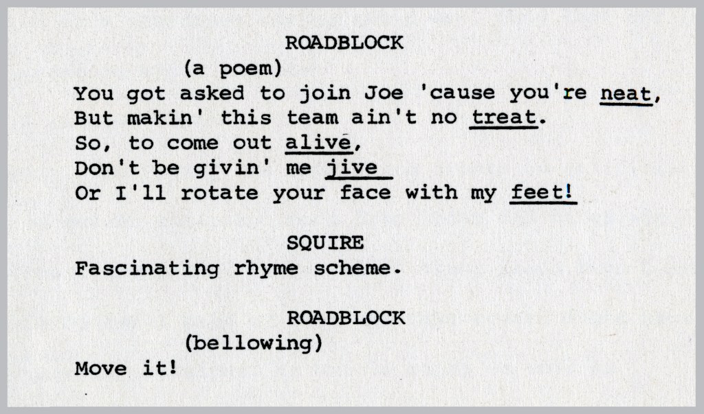 [Above: a bit from Friedman’s G.I. Joe: The Movie “story outline (expanded version),” dated July 1st, 1985. This predates the final screenplay by roughly seven months. Tons of ideas were proposed, changed, and dropped in that time.]