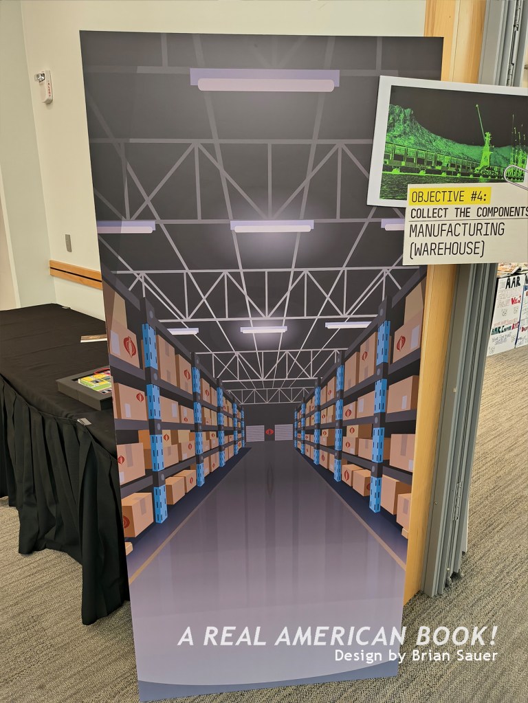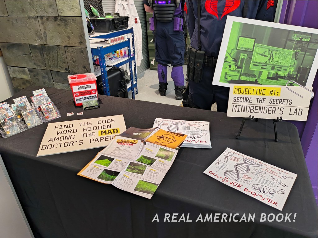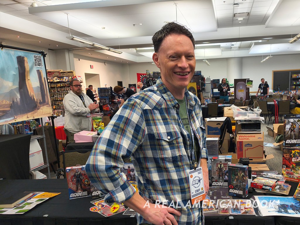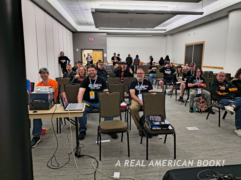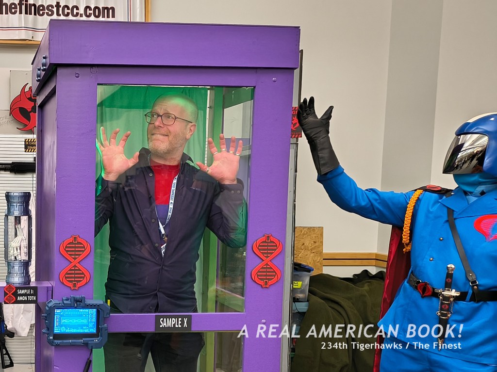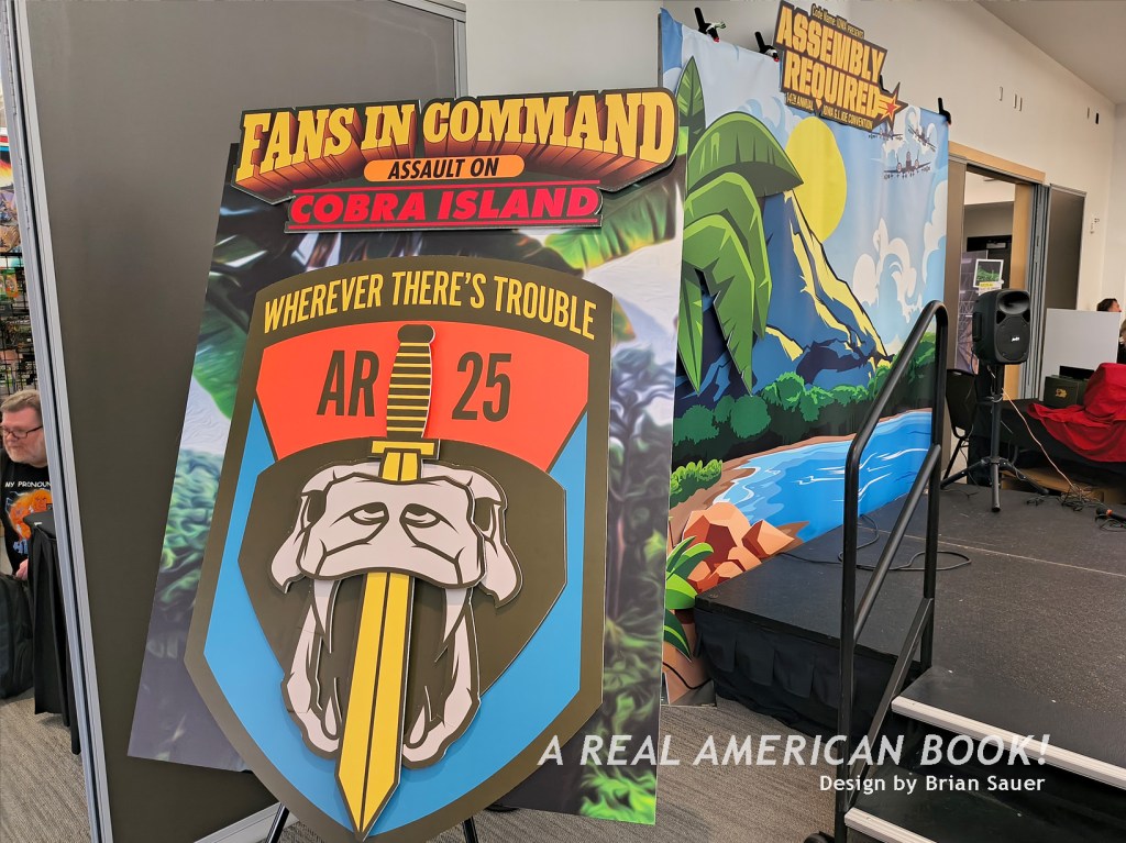 There’s Brian Sauer at a different convention, selling AR shirts, generally promoting AR, and specifically starting the “storyline” that we were “playing” at AR ’25 — we were engaging on this Assault on Cobra Island. And this map was now the back of the Assault on Cobra Island game foldout. (Although Sauer, ever the tinkerer, had slightly changed the Cobra character art since the summer, because why makes things easy?) And these Joes in the custom box set were the same Joes on those pins from dinner the previous night. And jumping to the hallway outside the convention room, these were the poster-size headshot portraits (that I’ve used as the opening title image of each of these blog posts). So the story of Assault of Cobra Island is that these specific Joes were on this mission to stop those specific Cobra agents.