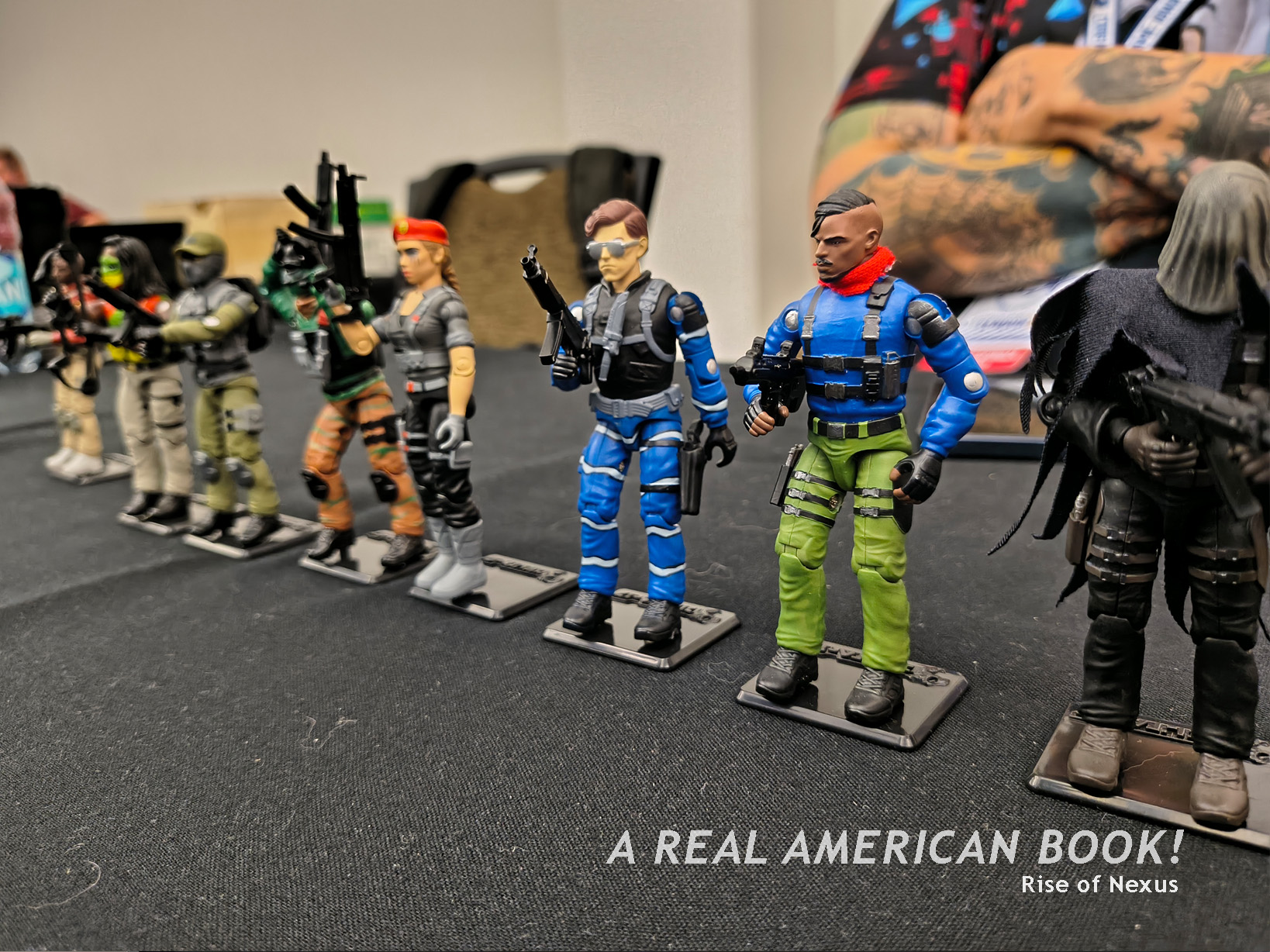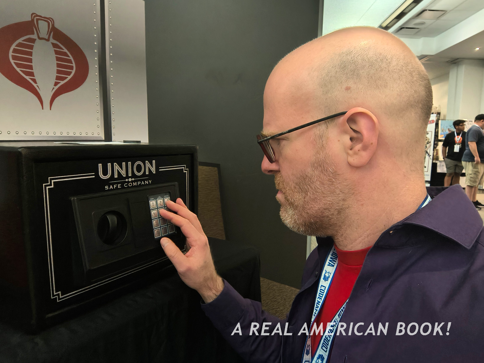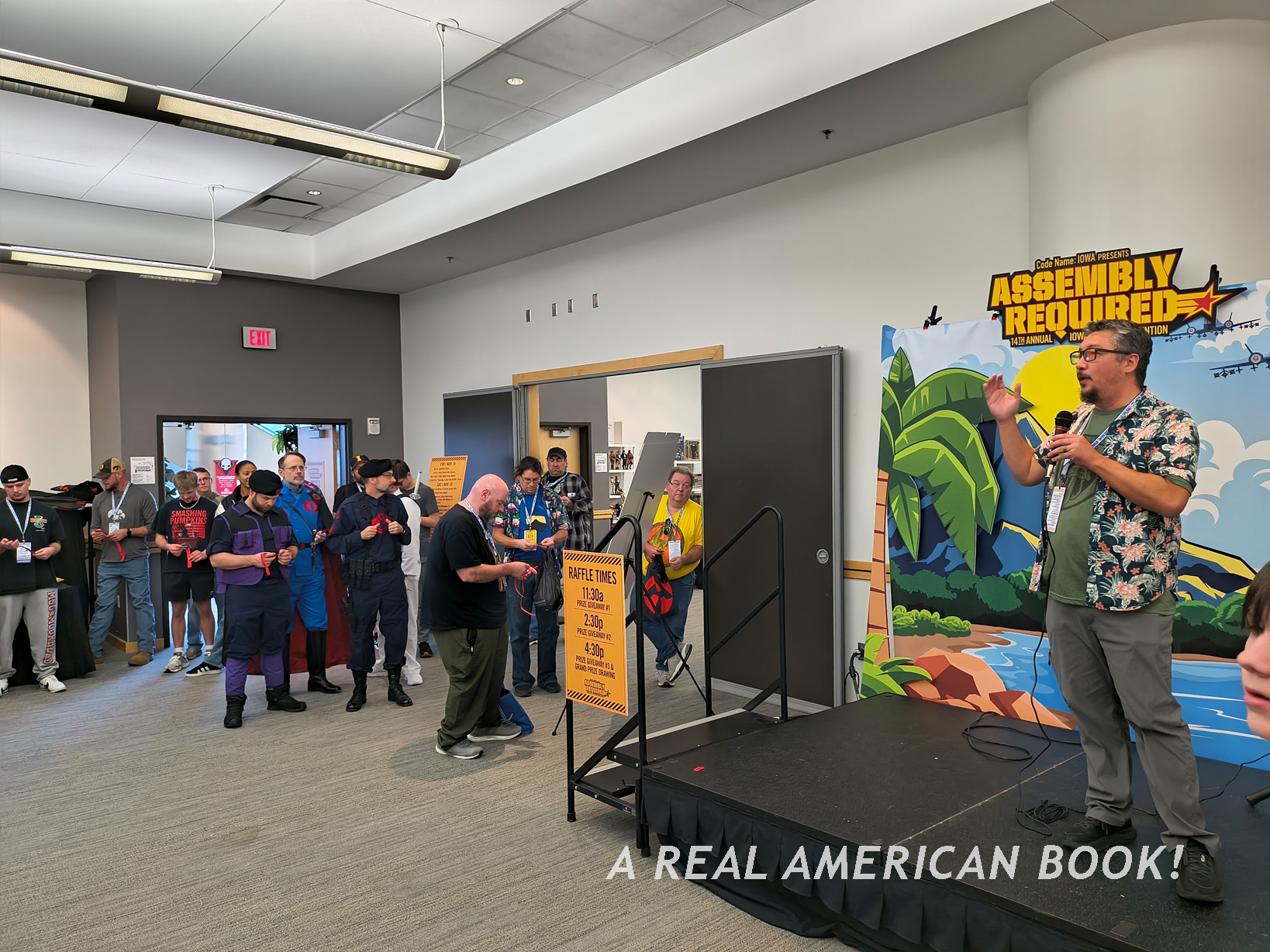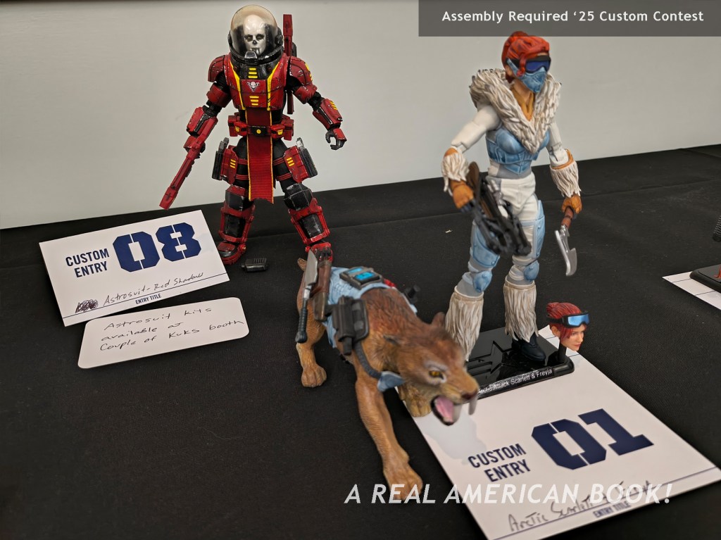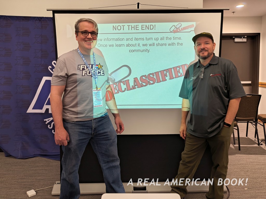 There’s Brian Sauer at a different convention, selling AR shirts, generally promoting AR, and specifically starting the “storyline” that we were “playing” at AR ’25 — we were engaging on this Assault on Cobra Island. And this map was now the back of the Assault on Cobra Island game foldout. (Although Sauer, ever the tinkerer, had slightly changed the Cobra character art since the summer, because why makes things easy?) And these Joes in the custom box set were the same Joes on those pins from dinner the previous night. And jumping to the hallway outside the convention room, these were the poster-size headshot portraits (that I’ve used as the opening title image of each of these blog posts). So the story of Assault of Cobra Island is that these specific Joes were on this mission to stop those specific Cobra agents.