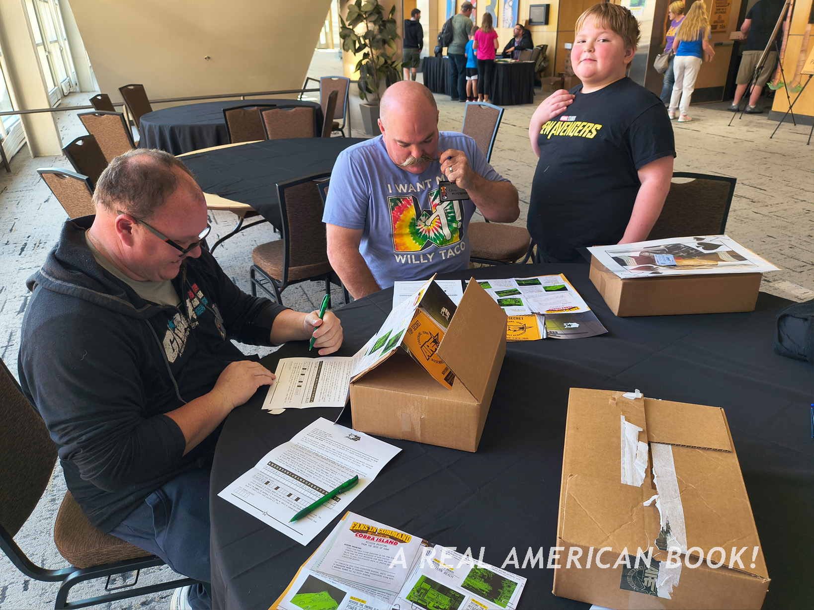 But first, out in the hallway, here was a trio trying to solve the Fans in Command game. I would see this over and over again, individuals and families walking around the con, looking for the game stations, writing on these foldouts, and later, claiming their prizes. (I played later in the day, see below.)
