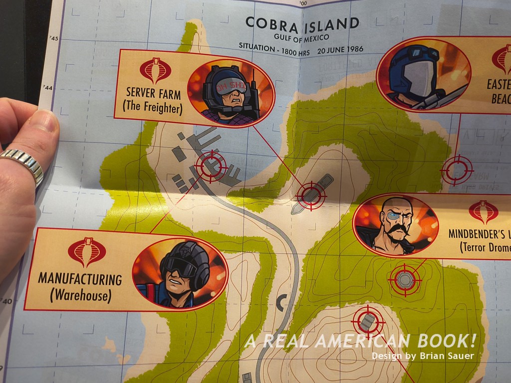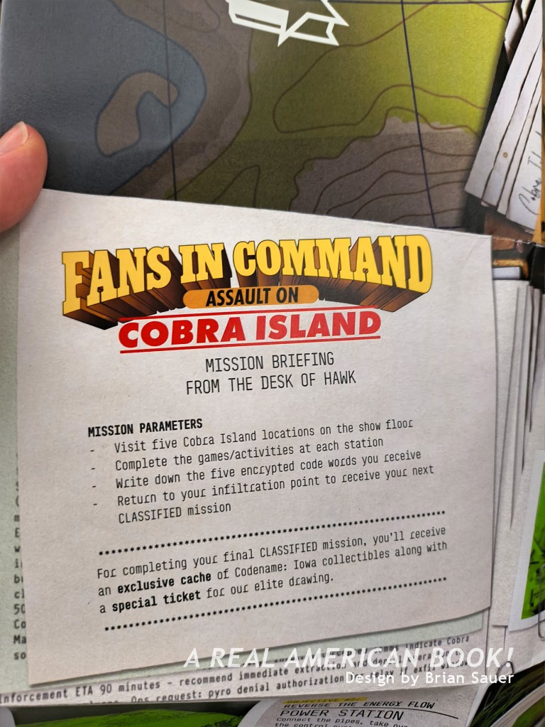 Back in the con hall I had some time until the next panel, so I started the Fans in Command: Assault on Cobra Island game. Here’s part of the inside of the foldout map/game card, which you could grab at the registration table. Note how carefully Brian Sauer recreated the font and treatment of the 1986 “Live The Adventure” display font: