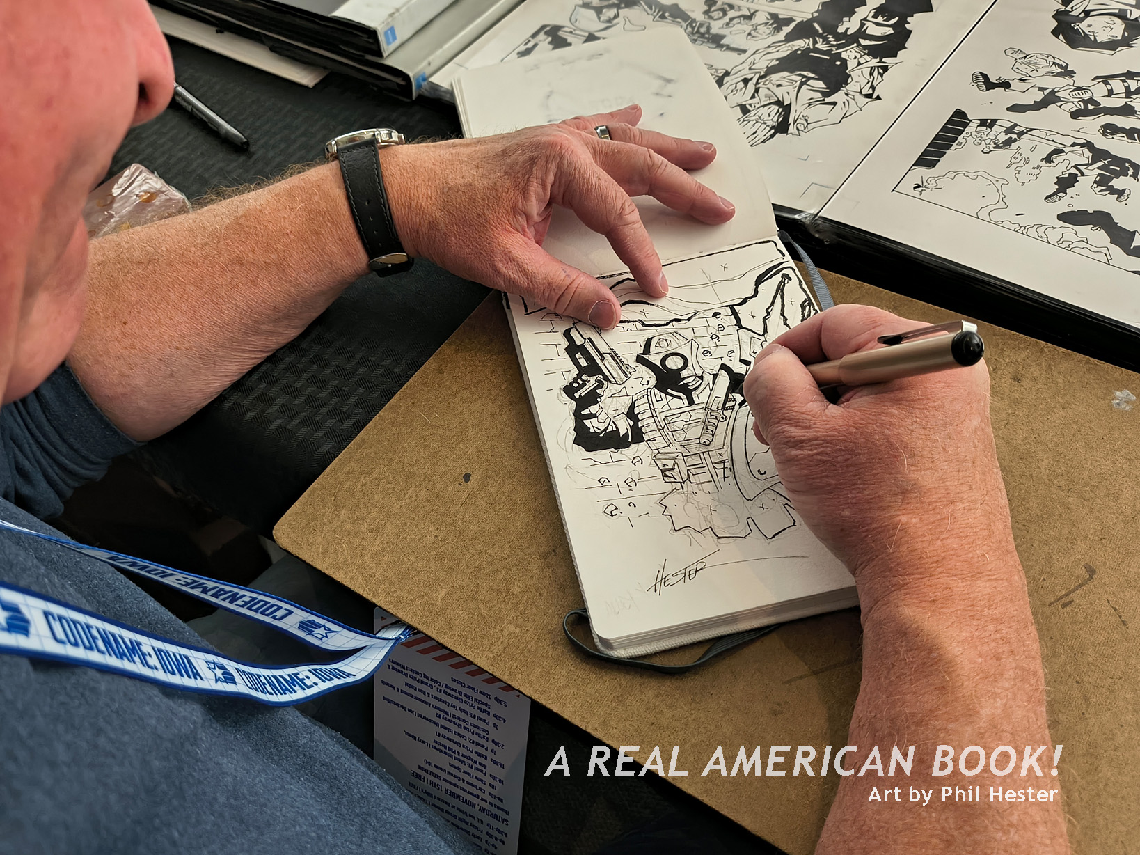 Thanks to Brian Sauer for asking me to moderate! Fun fact: When he wasn’t answering a question during our panel, Phil Hester was drawing a Wild Bill head sketch on a blank cover. If you see photos from this panel and Hester is looking down, he’s drawing! From after the panel, here’s a zoom-in on a photo of that sketch in-process: