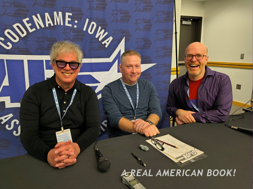This would have been a keen line-up: Larry Hama, known for writing and breakdown-penciling the famous “Silent Interlude” issue ofG.I. Joe (plus writing a half dozen other wordless Joe stories), Ron Wagner, who penciled a wordless story in G.I. Joe Yearbook #3 plus a hard-to-find 6-pager in the Snake Eyes Declassified collection, and Phil Hester, who wrote and penciled the wordless G.I. Joe: Silent Missions – Beach Head out this past April. [Here’s Mark’s and my Talking Joe interview with him, audio-only or video]. Hama had to cancel his appearance at Assembly Required because of travel complications. This was a month into the US Federal government shutdown and a week into the FAA’s forced reduction in airplane flight traffic. A real loss for AR that such an anchor of a guest couldn’t be there to sign autographs and draw sketches, but in terms on our panel, interviewing two people might be easier than three, and I could more than fill 50 minutes with just Wagner and Hester. And I did!