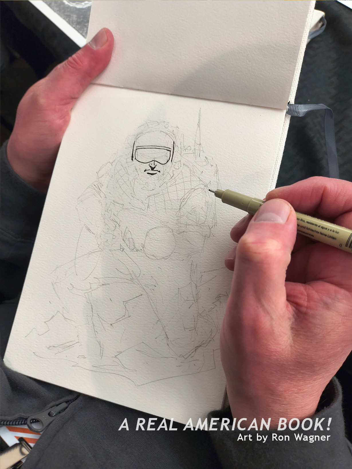 In the main room, Ron Wagner was drawing in someone’s small notebook: