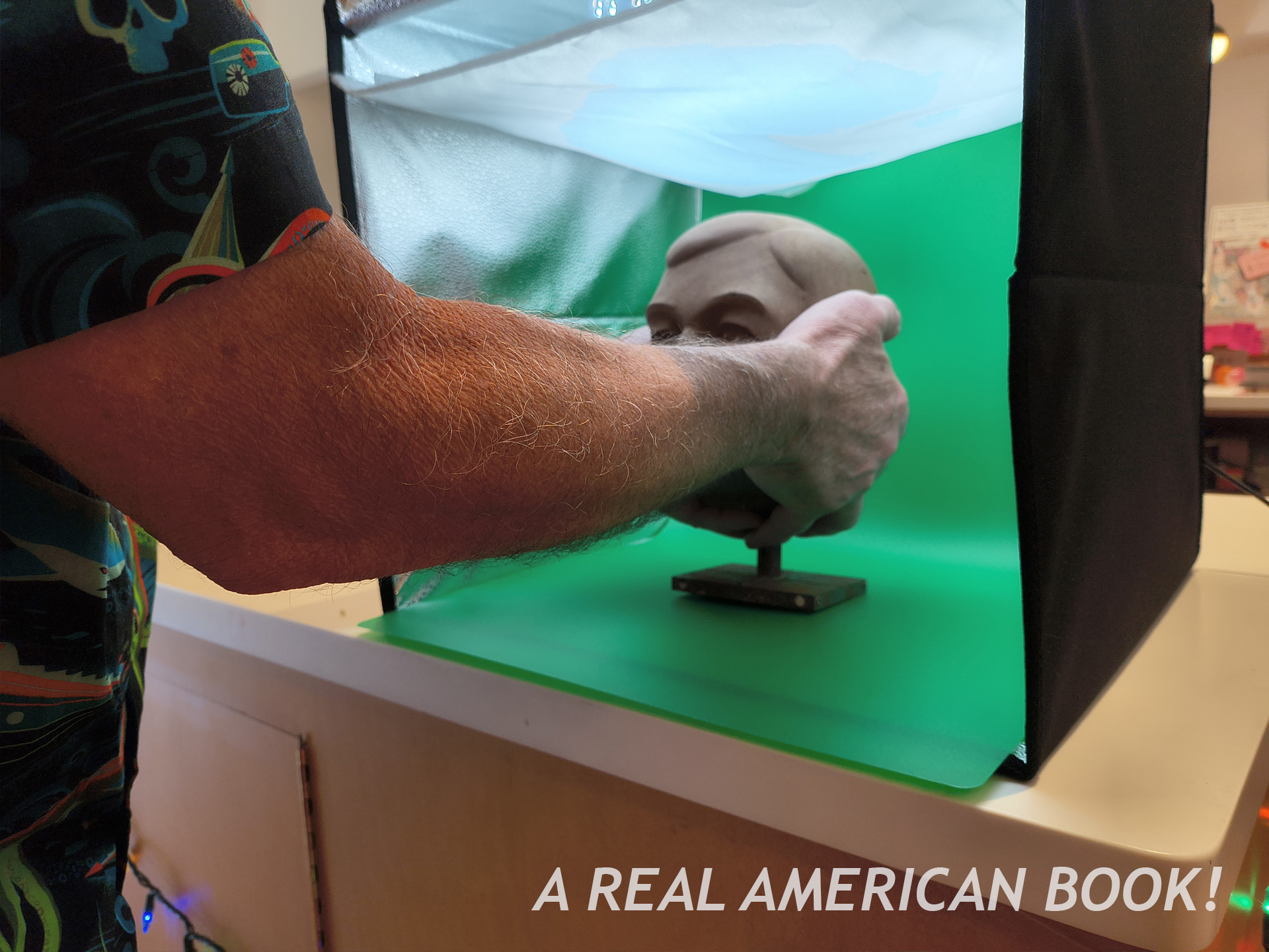 My wife owns one of those lightbox cubes for taking product photos. She’s interested in anthropology and childhood development, and for a class she took she did use this cube to shoot a ceramic figure of Chang and Eng Bunker, the original Siamese Twins. (They’re Siamese because they were born in Siam, the modern term is “conjoined twins,” Lisa Simpson tells me.) My wife showed me how to set up the cube the day before — easy! On the 4th DePriest was meeting someone else for breakfast, and would get to my shop around 11am. I was there early, clearing part of the counter and setting up the cube. Hub Comics opens at noon, so we had a short window — give DePriest a tour of the store, then use my smartphone to photograph the four items he brought. The lightbox came with six color backgrounds, so I couldn’t overthink that. If I wanted green, there was just the one green.
