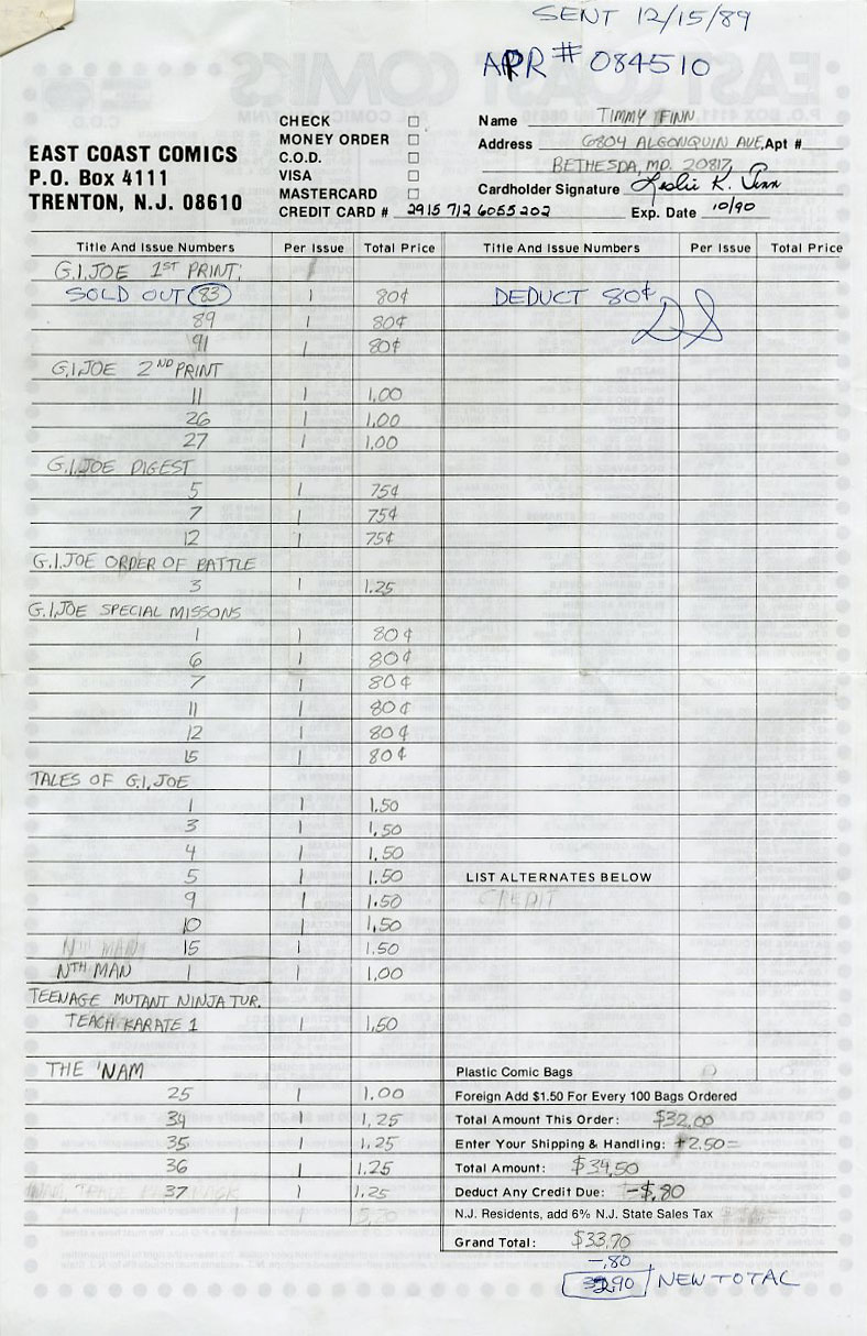 This probably doesn’t mean anything to you, but for me this image is all nostalgia: The handwriting of my 11-year old self, my mom’s signature, specific G.I. Joe gaps we were attempting to fill, the fact that I still didn’t understand what “Alternates” were – (second choices in case a comic was sold out, so East Coast didn’t have to issue credit slips), and the fact that we were trying out a new series (Nth Man, Ninja Turtles Teach Karate).
