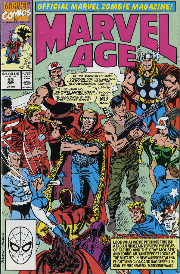 Leaning against the left wall and below the windows was Hama’s guitar. (Years later on a subsequent visit there was a guitar and a metal 1:1 scale working model of a machine gun, which made me think of the Warren Ellis quote “Larry Hama, perhaps unsurprisingly, knows a lot of people with guns, and so has marvelous stories to tell about stone lunatics with too much artillery who also happen to be comic artists.”) (And it’s telling that the one time Larry appeared on the cover to a Marvel comic book, he’s holding a machine gun.)
