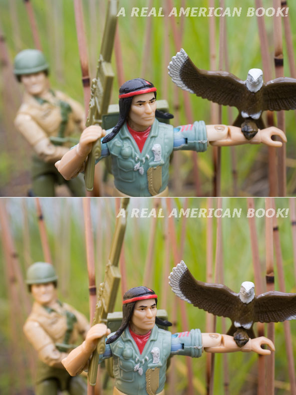 The general idea for these photos came from the toy photography of Brian Malloy and Erik Hildebrandt in John Michlig‘s G.I. Joe: The Complete Story of America’s Favorite Man of Action. (Regular readers will recognize that book as one of the two main inspirations for A Real American Book.) There are only four “fantasy” shots in Michlig, where the reader point of view is in scale with the 12-inch Joes, but the toys themselves are set against the scale of the man-made world. Rather than product shots, like a catalog displaying toys on a table top (even if the table top is a dressed set), I wanted story moments, like movie stills.