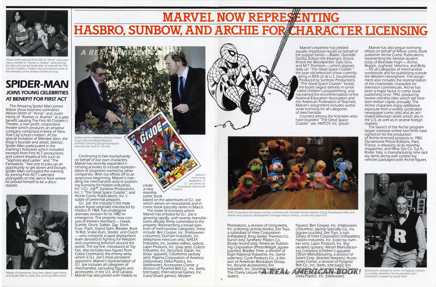 Here’s a fun bit of paperwork. When Hasbro relaunched G.I. Joe in 1982, the company rolled out the new toys with an impressive list of licensed products. This is common today, but was not then. As Marvel Comics was already handling the biggest license — a comic book — and had a licensing division, it made sense to partner in this way, so that Marvel could line up all those third-party companies wanting to put G.I. Joe on their consumer products. Here’s a slick trumpeting that fact. Only pages 3-4 are germane, but I’ve reproduced 1 and 2 as well since they’re fun, and since Spider-Man and His Amazing Friends is a cousin to the G.I. Joe cartoon. (Pages 5-8 of this catalog are not reproduced here.)