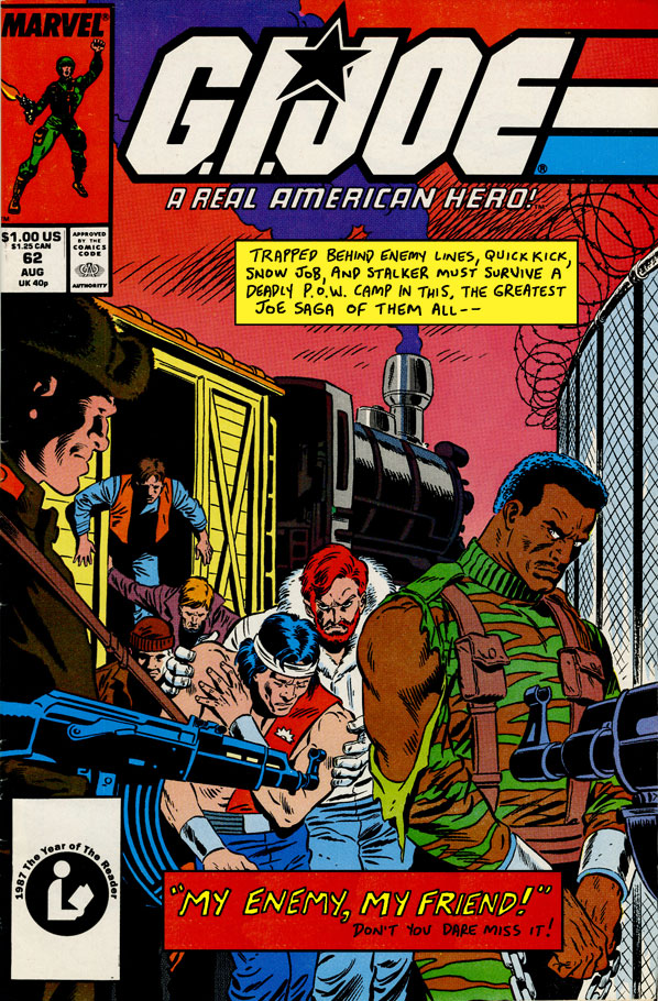 There’s tension. You’re worried about the prisoners. One looks injured, one looks seriously ticked off. Maybe he’ll try to escape! Visual cues let you know they’re out of their element: barbed wire and AK-47s particularly. These guys are prisoners behind the Iron Curtain. That’s a scary thought for a soldier in 1988 or so, or a boy following his exploits. But the cover loses all its power if there’s copy: