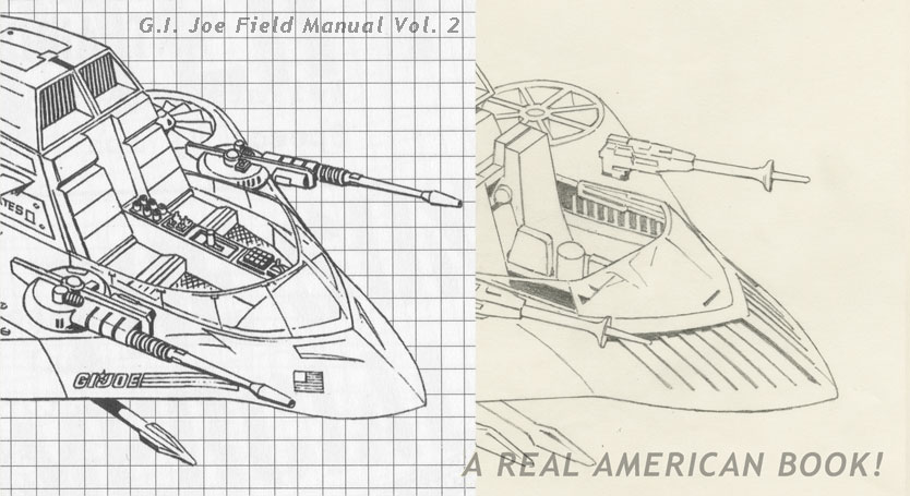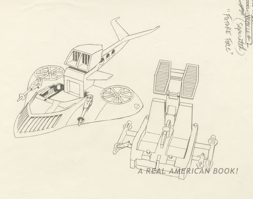 Or in this case, commercials, since animated Battle Force 2000 only appeared in G.I. Joe advertising. And I should say that artists tended to see photocopies of them in very-actual black and white. Rarer is seeing the original art, here, pencil on paper, dark grey on off-white. Russ Heath, who’s gotten some attention here at A Real American Book, drew today’s post: Three views of the “Vindicator” hovercraft.